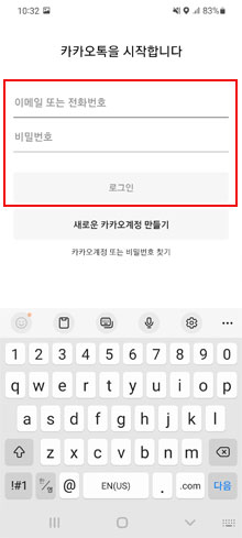 - 카카오톡 계정과 패스워드를 입력 후 로그인을 합니다.